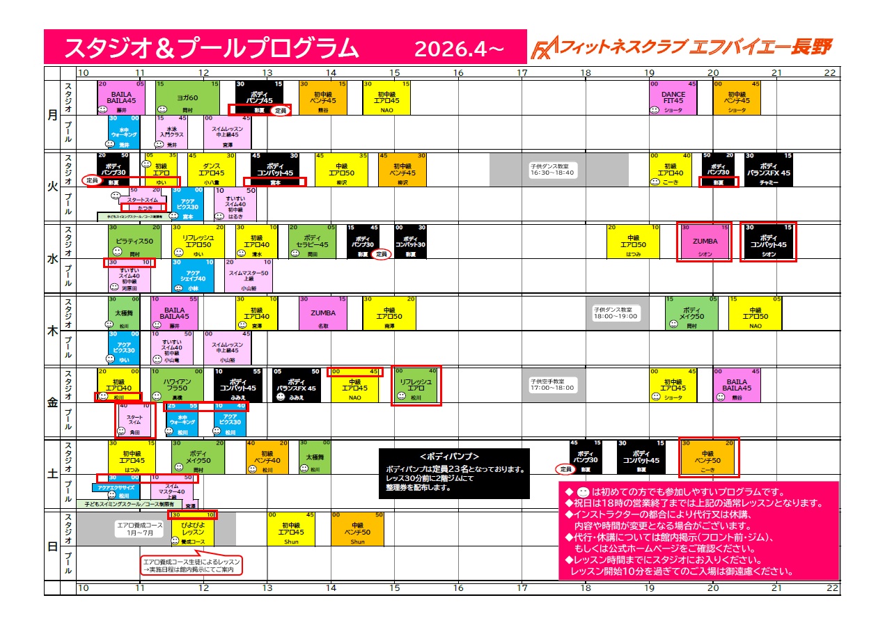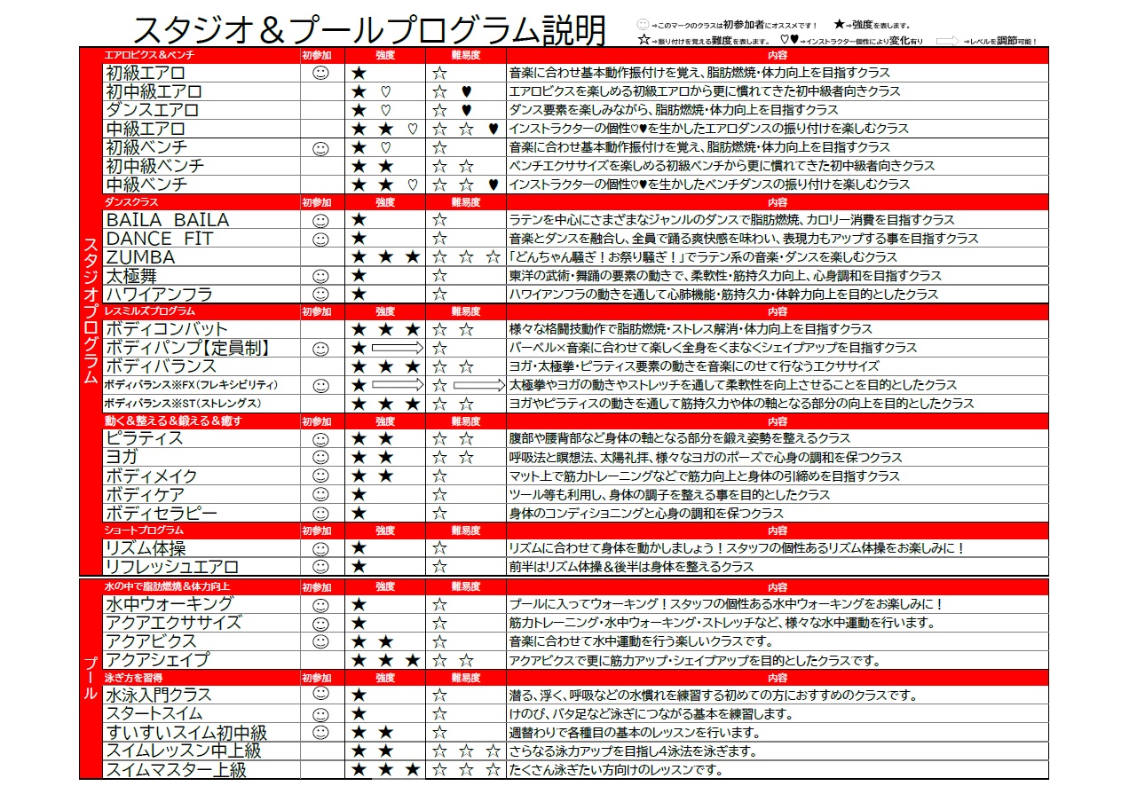 スタジオレッスン、プールレッスンについては詳細をご覧ください。