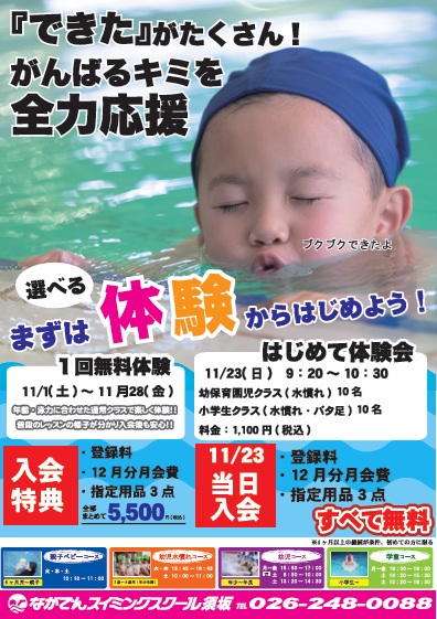 ながでんスイミングスクール須坂では、11月23日(日)はじめて体験会を実施します。